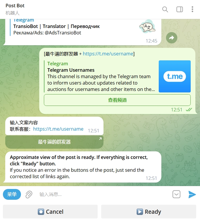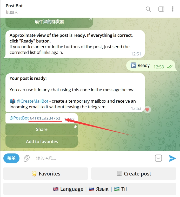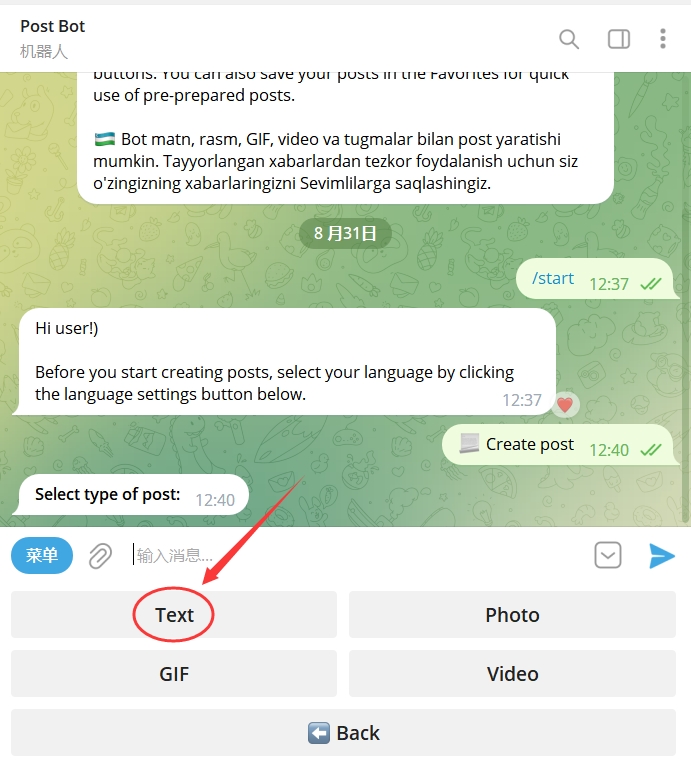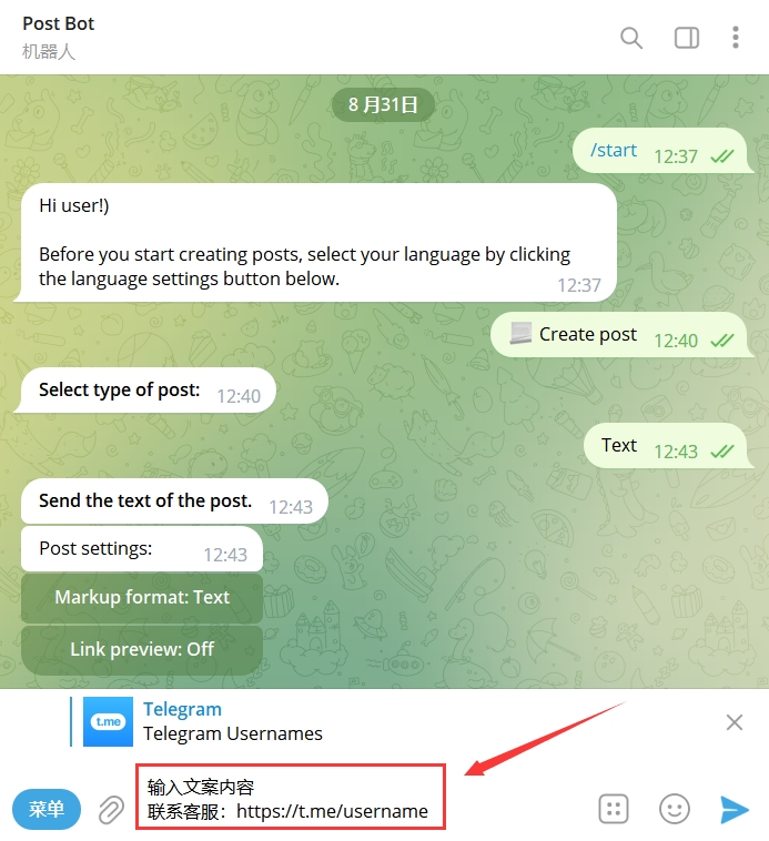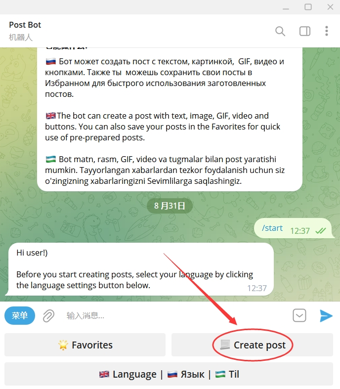 1、打开机器人 @postbot,点“开始”后,点击右下角“Create post”