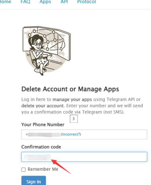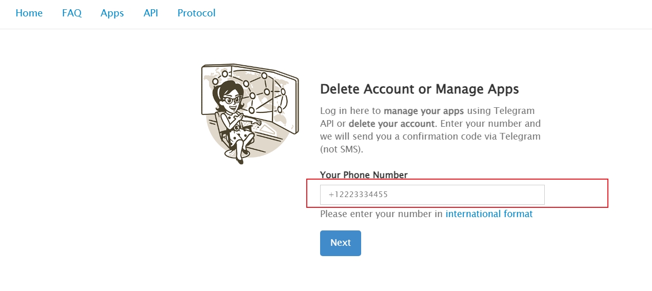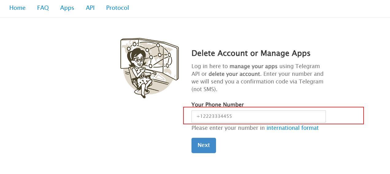 第一步 打开官方网址:https://my.telegram.org/ 并输入你的电报手机号码(记得带+号) 点击:NEXT