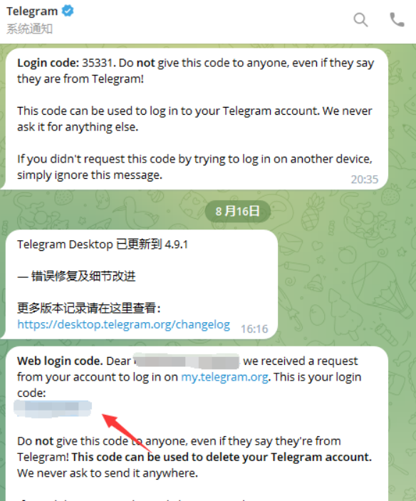 第二步 这时候你的电报会收到一个 code (复制) 如下图: