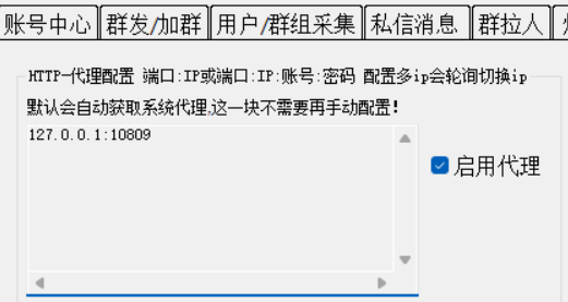 这种情况回到群发软件代理这里填 127.0.0.1:10809,127.0.0.1是固定的! 后面的端口是根据代理软件的不同根据所用软件里的设置来