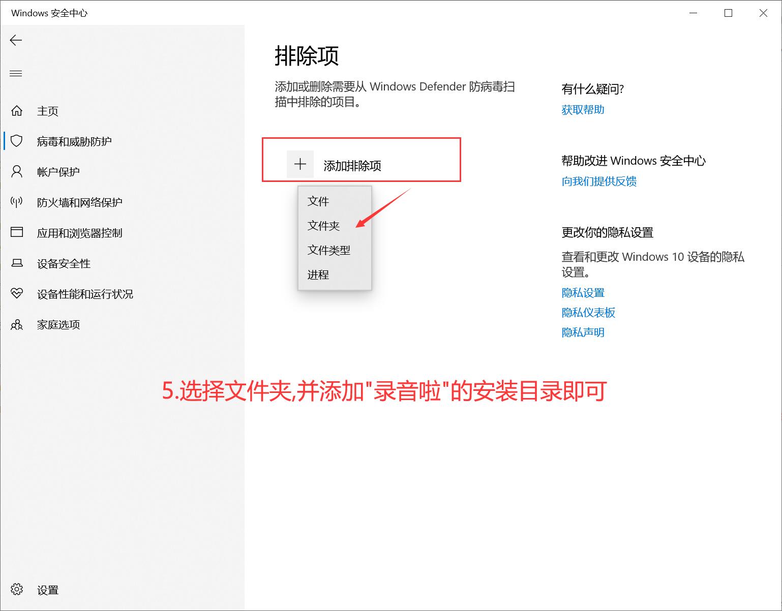 6.请点击添加排除项,并且选择文件夹